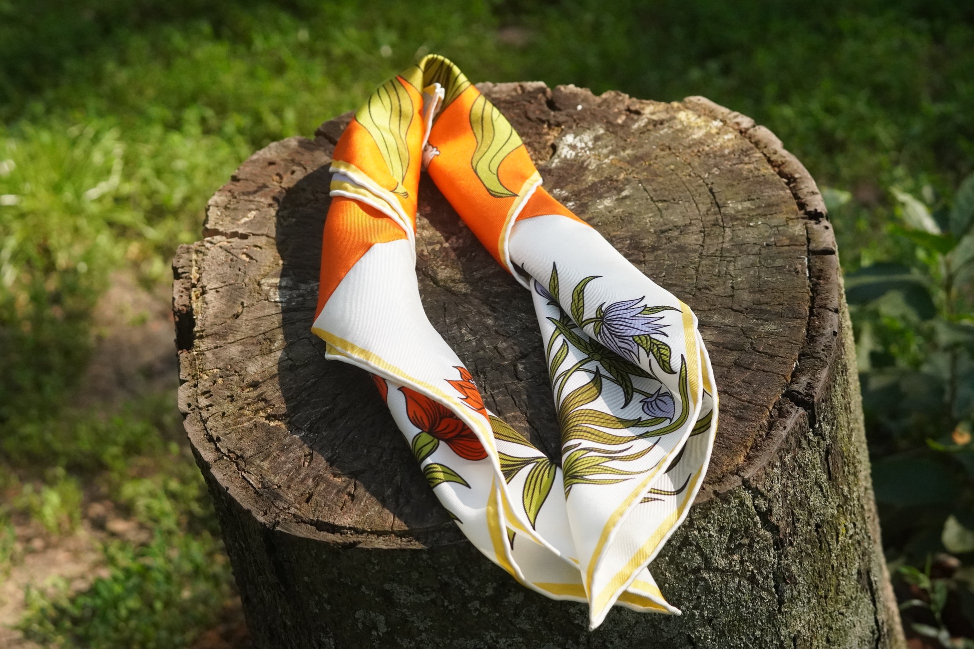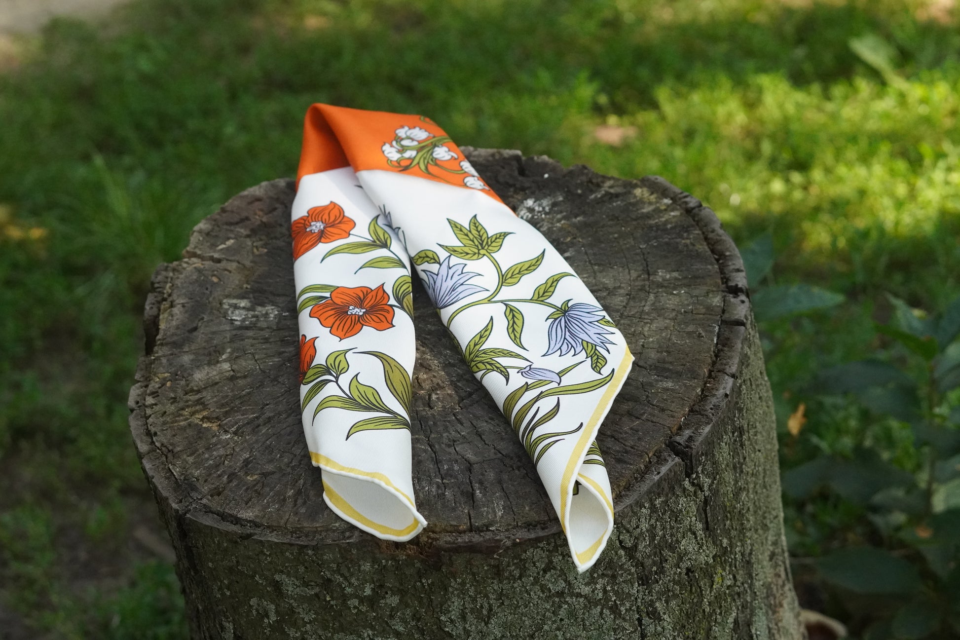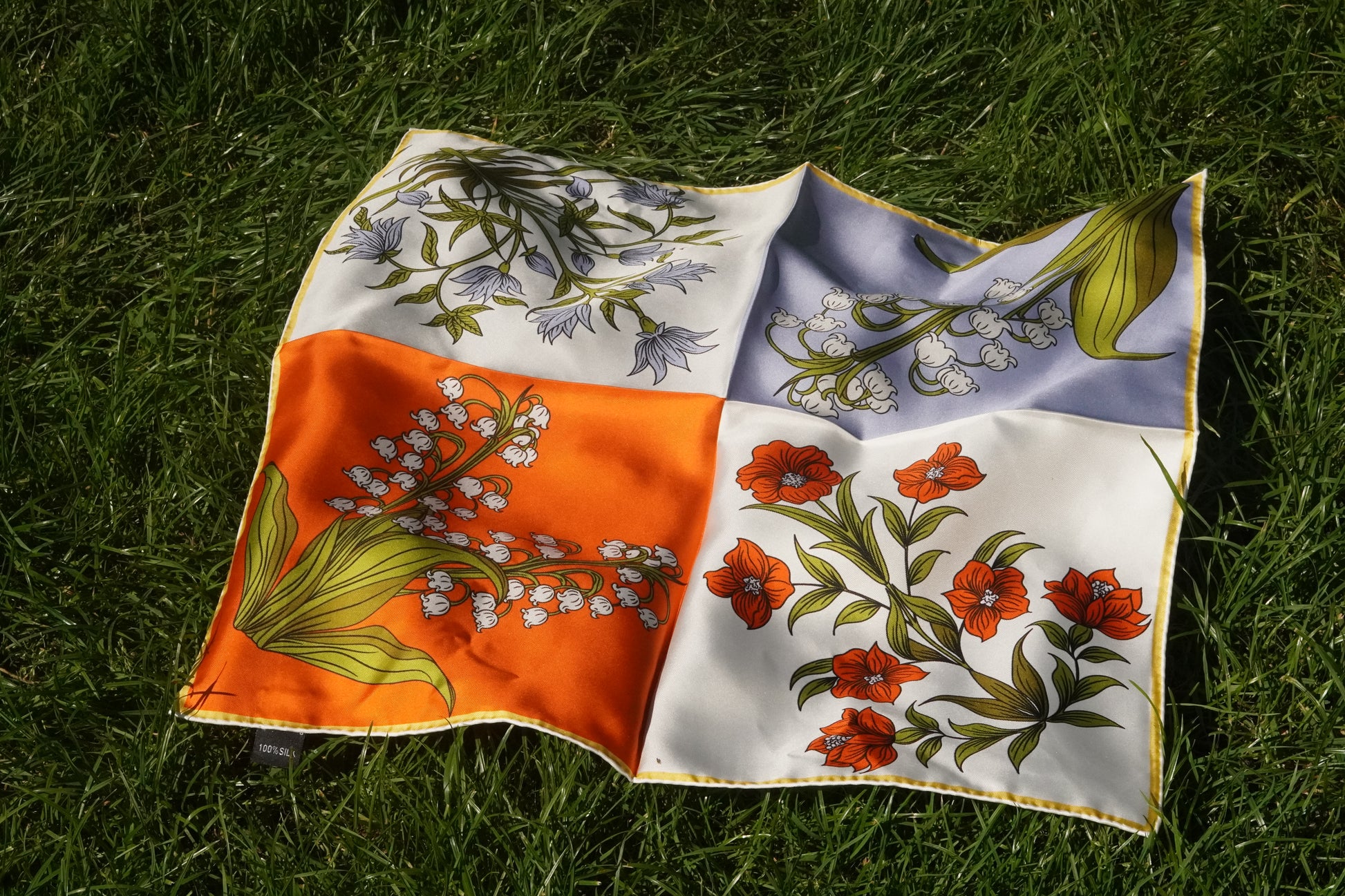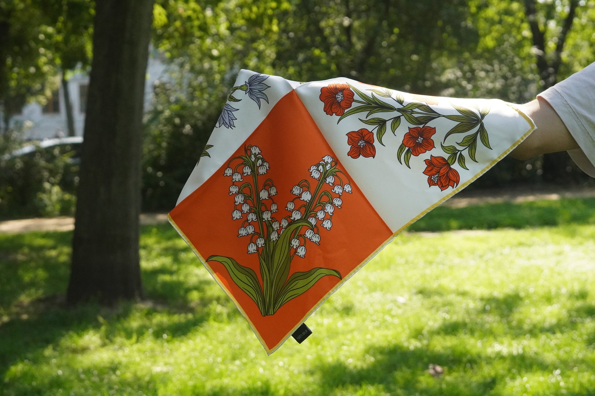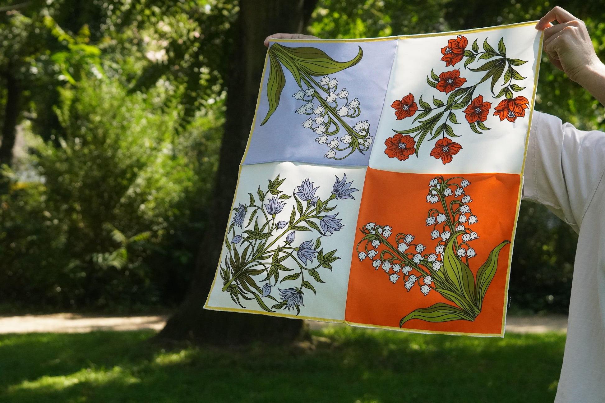 Das Seidentuch „Blütengespräch“ lädt ein, den Dialog der Natur zu entdecken. Maiglöckchen flüstern von zarter Reinheit, Mohnblüten erzählen von leidenschaftlicher Kraft, Glockenblumen klingen wie ein Echo der Stille. Jede Falte offenbart eine neue Stimme, jede Farbe eine andere Melodie – ein Gespräch aus Seide, das niemals endet.