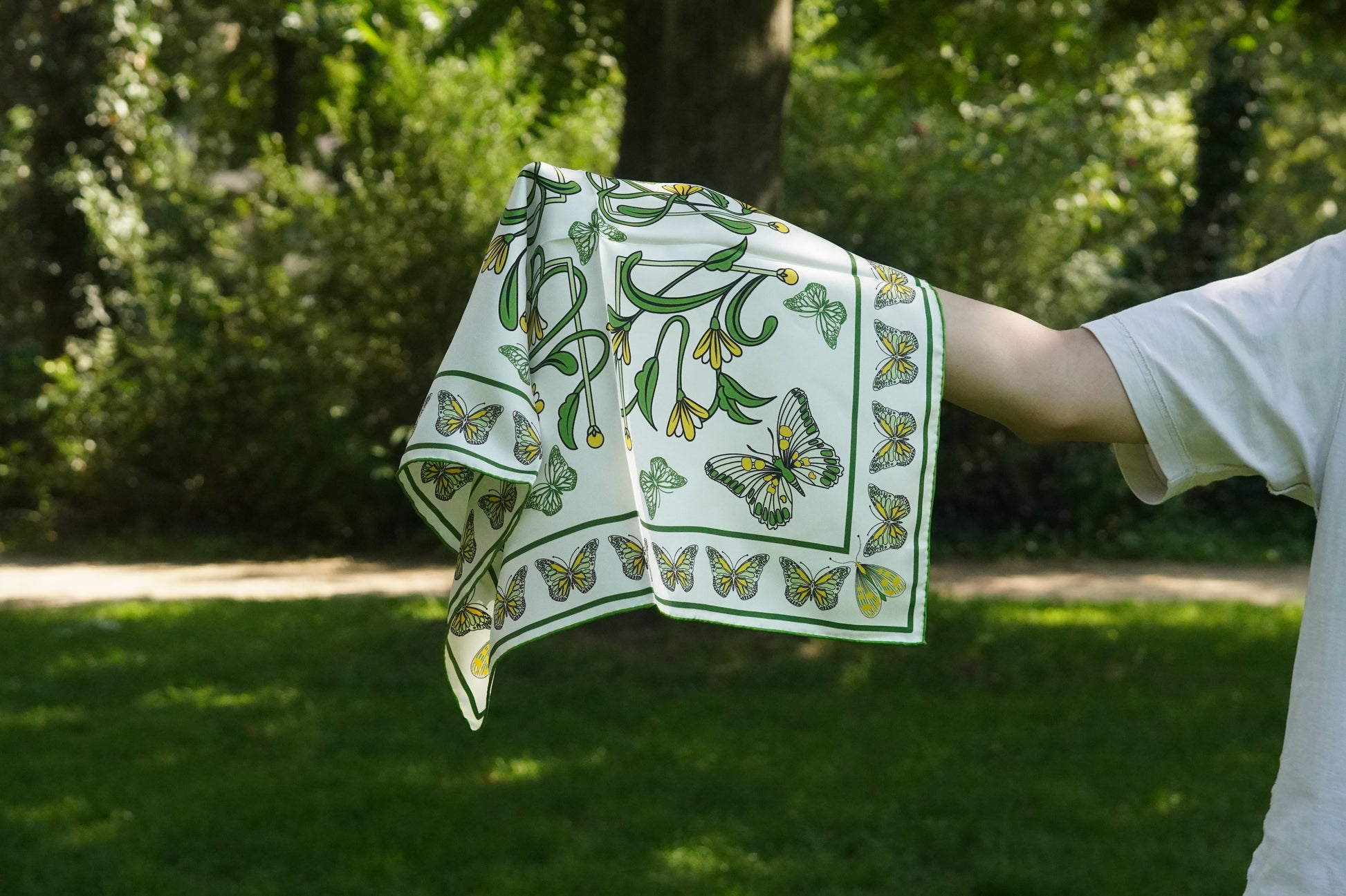 Das Seidetuch "Schmetterling" entfaltet seine Poesie in einem Tanz der Schmetterlinge. Zart wie ein Flügelschlag und zugleich kraftvoll wie die Natur selbst, ist es eine Hommage an Leichtigkeit, Verwandlung und unendliche Freiheit. In jeder Faltung offenbart sich ein neues Spiel aus Farben und Linien, ein immer wieder neu zu entdeckendes Universum der Eleganz.